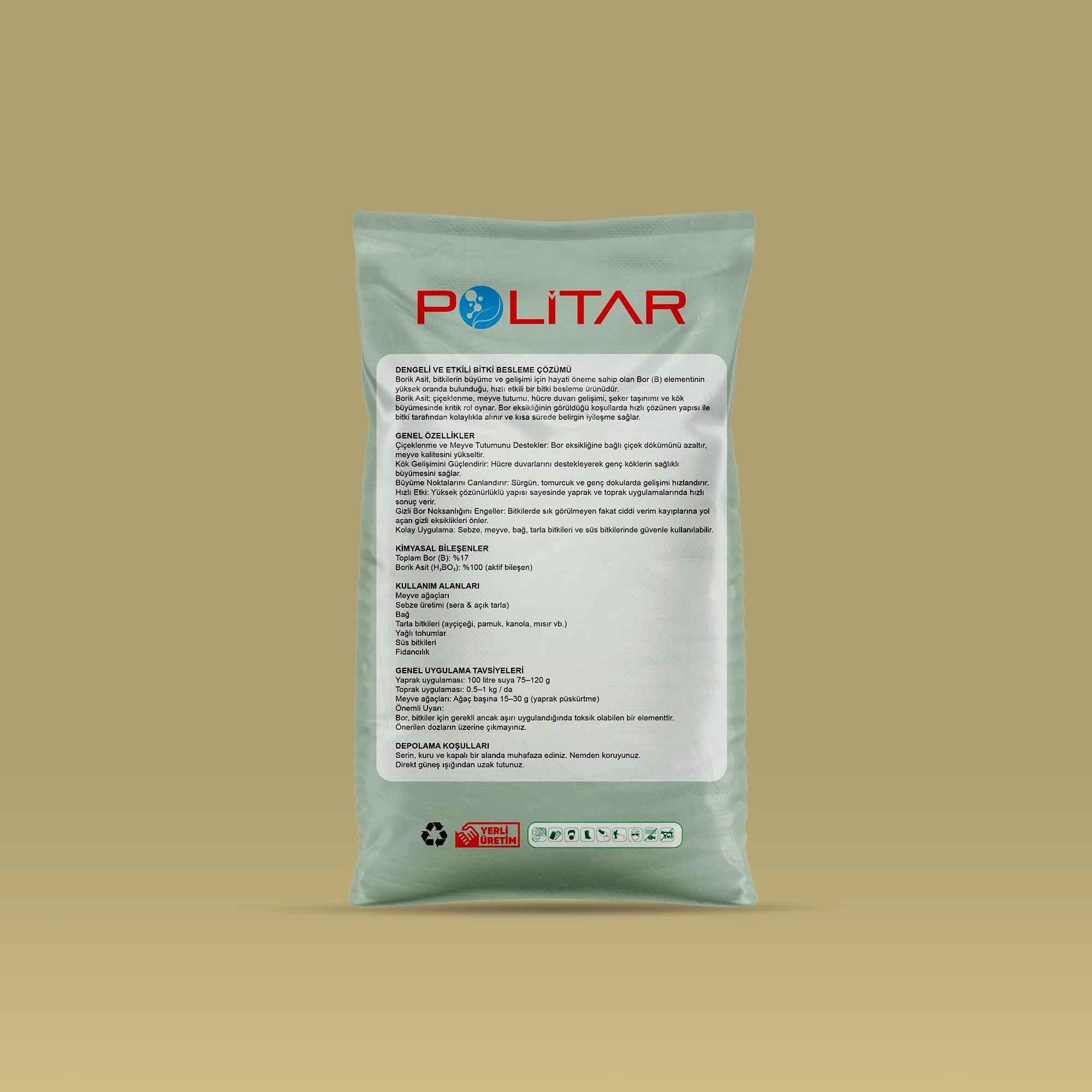 Borik Asit, bitkilerin büyüme ve gelişimi için hayati öneme sahip olan Bor (B) elementinin yüksek oranda bulunduğu, hızlı etkili bir bitki besleme ürünüdür.