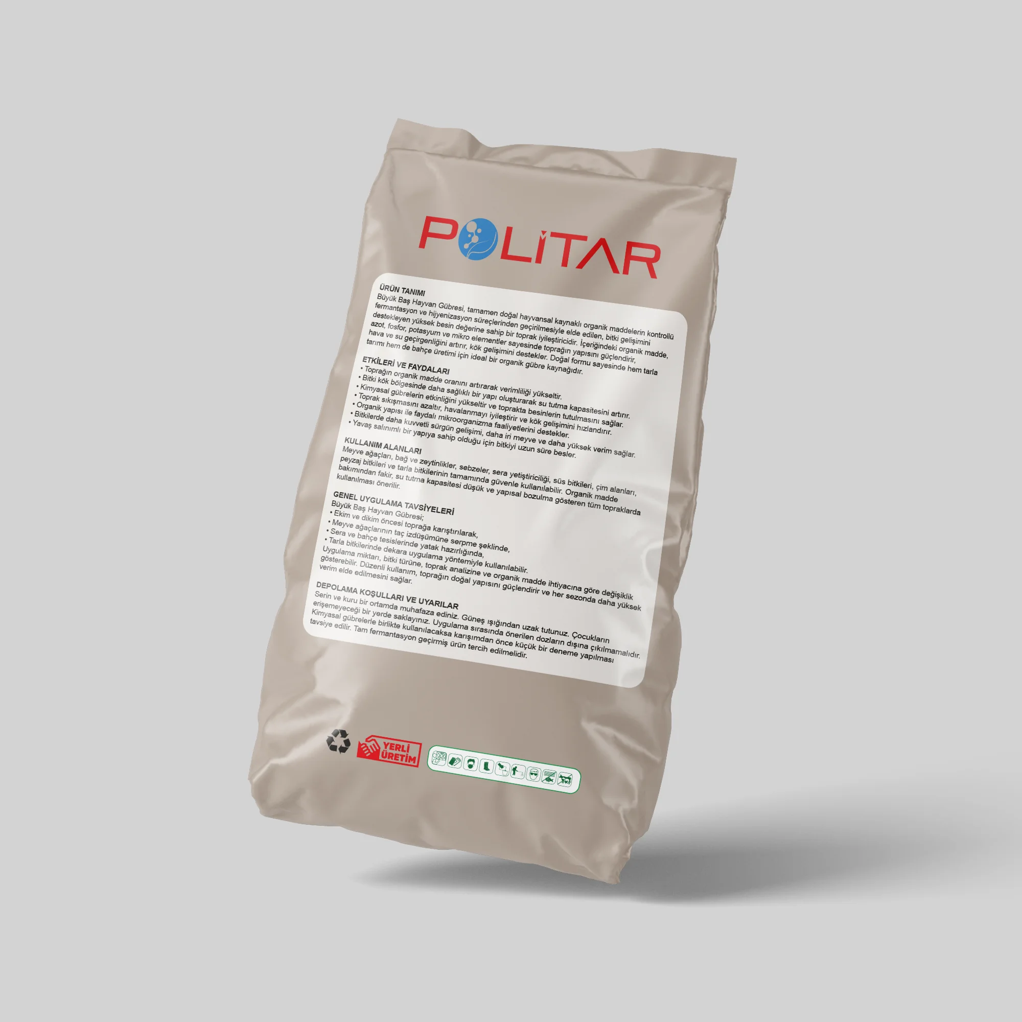 Büyük Baş Hayvan Gübresi, tamamen doğal hayvansal kaynaklı organik maddelerin kontrollü fermantasyon ve hijyenizasyon süreçlerinden geçirilmesiyle elde edilen, bitki gelişimini destekleyen yüksek besin değerine sahip bir toprak iyileştiricidir. İçeriğindeki organik madde, azot, fosfor, potasyum ve mikro elementler sayesinde toprağın yapısını güçlendirir, hava ve su geçirgenliğini artırır, kök gelişimini destekler. Doğal formu sayesinde hem tarla tarımı hem de bahçe üretimi için ideal bir organik gübre kaynağıdır.