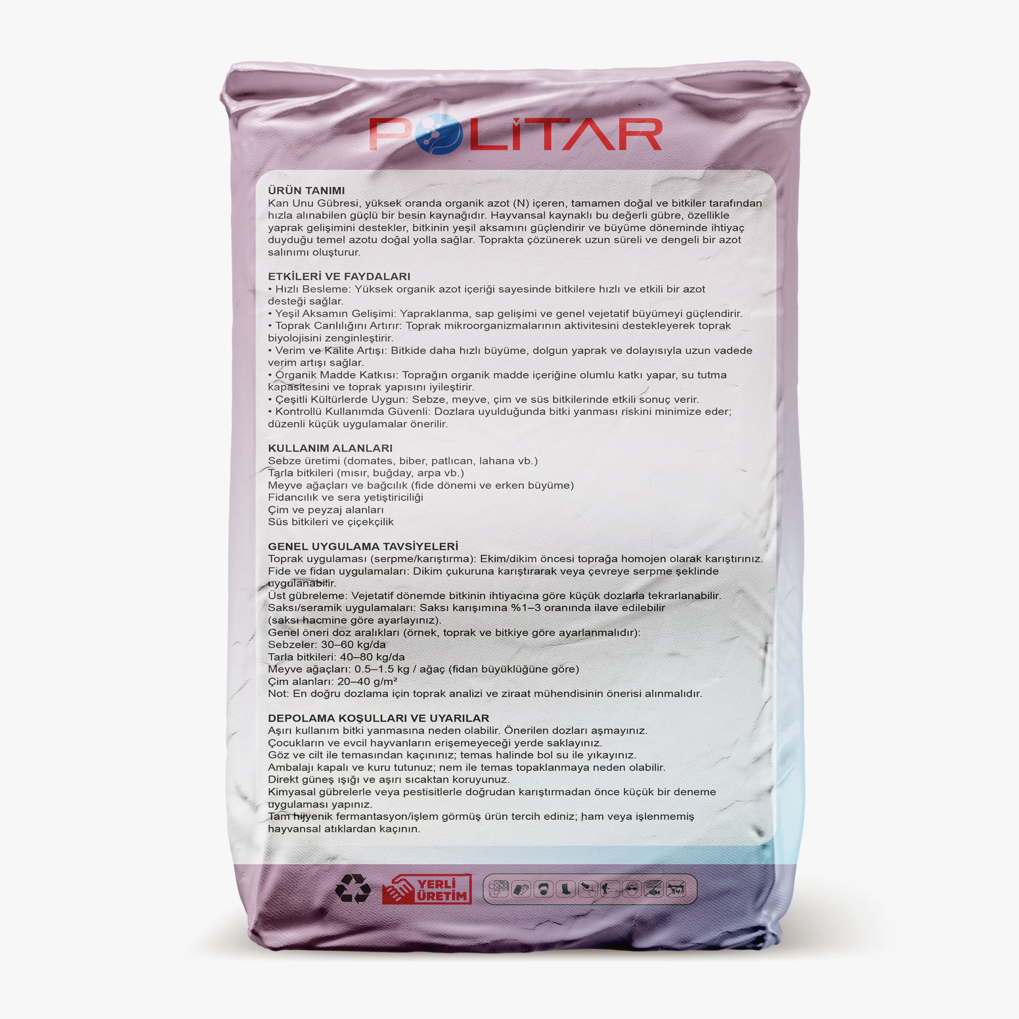 Kan Unu Gübresi, yüksek oranda organik azot (N) içeren, tamamen doğal ve bitkiler tarafından hızla alınabilen güçlü bir besin kaynağıdır. Hayvansal kaynaklı bu değerli gübre, özellikle yaprak gelişimini destekler, bitkinin yeşil aksamını güçlendirir ve büyüme döneminde ihtiyaç duyduğu temel azotu doğal yolla sağlar. Toprakta çözünerek uzun süreli ve dengeli bir azot salınımı oluşturur.