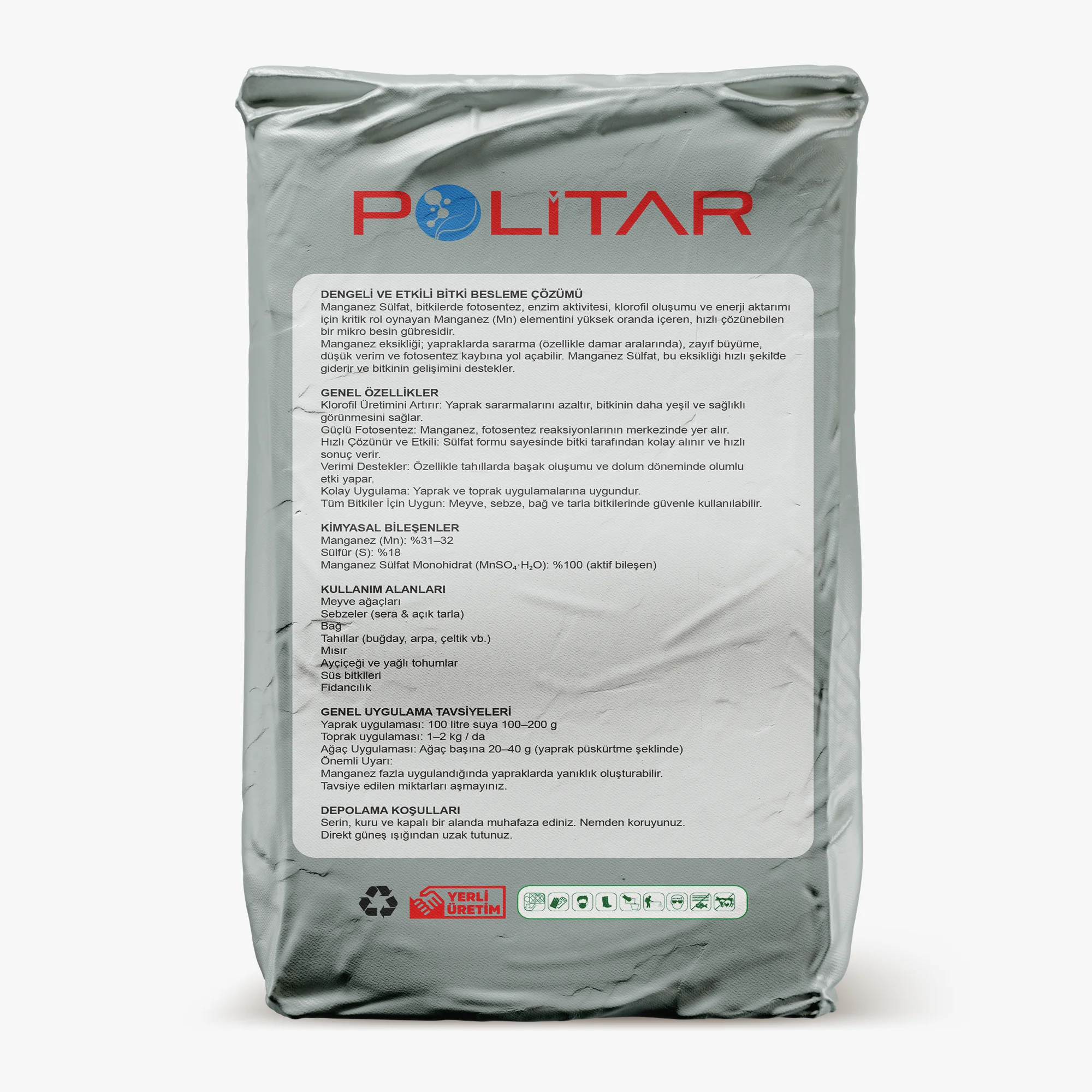 Manganez Sülfat, bitkilerde fotosentez, enzim aktivitesi, klorofil oluşumu ve enerji aktarımı için kritik rol oynayan Manganez (Mn) elementini yüksek oranda içeren, hızlı çözünebilen bir mikro besin gübresidir.