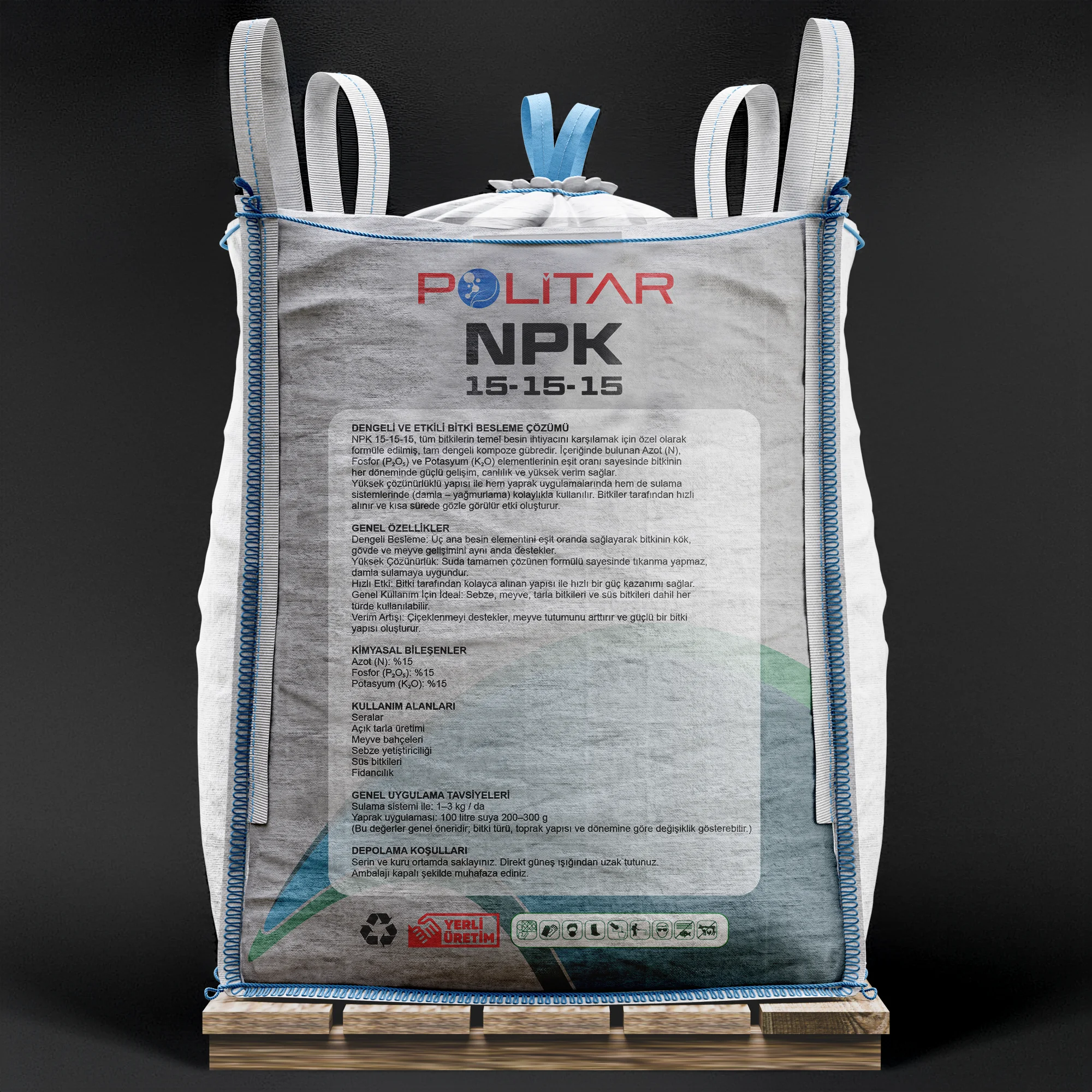 NPK 15-15-15, bitkilerin temel besin ihtiyacını karşılayan, dengeli formüle edilmiş kompoze gübredir. Azot (N), Fosfor (P₂O₅) ve Potasyum (K₂O) elementlerinin eşit oranlarda bulunması sayesinde bitkilerin tüm gelişim dönemlerinde sağlıklı büyüme, güçlü kök yapısı ve yüksek verim sağlar.