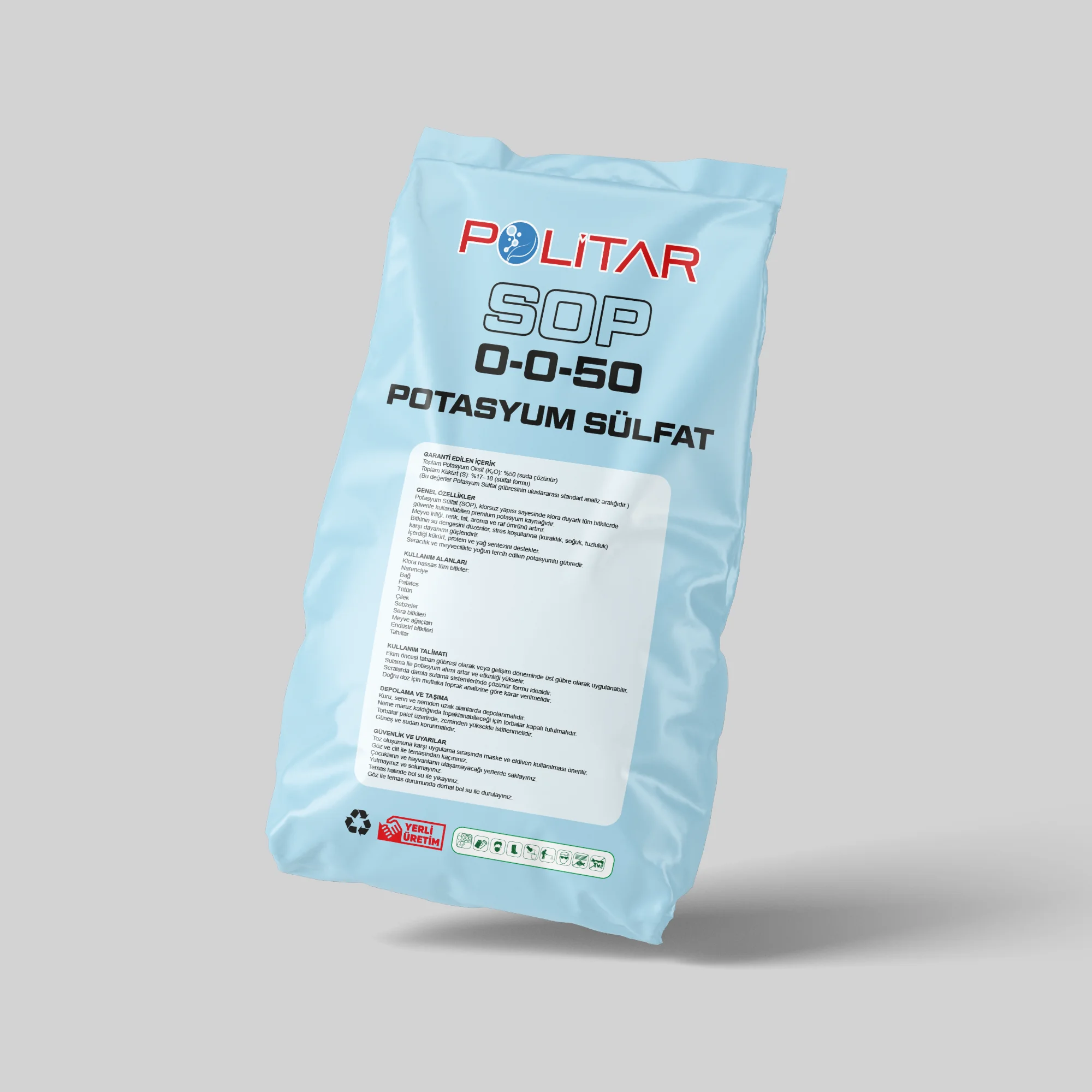 Potasyum Sülfat (SOP), klorsuz yapısı sayesinde klora duyarlı tüm bitkilerde güvenle kullanılabilen premium potasyum kaynağıdır. Meyve iriliği, renk, tat, aroma ve raf ömrünü artırır. Bitkinin su dengesini düzenler, stres koşullarına (kuraklık, soğuk, tuzluluk) karşı dayanımı güçlendirir. İçerdiği kükürt, protein ve yağ sentezini destekler. Seracılık ve meyvecilikte yoğun tercih edilen potasyumlu gübredir.