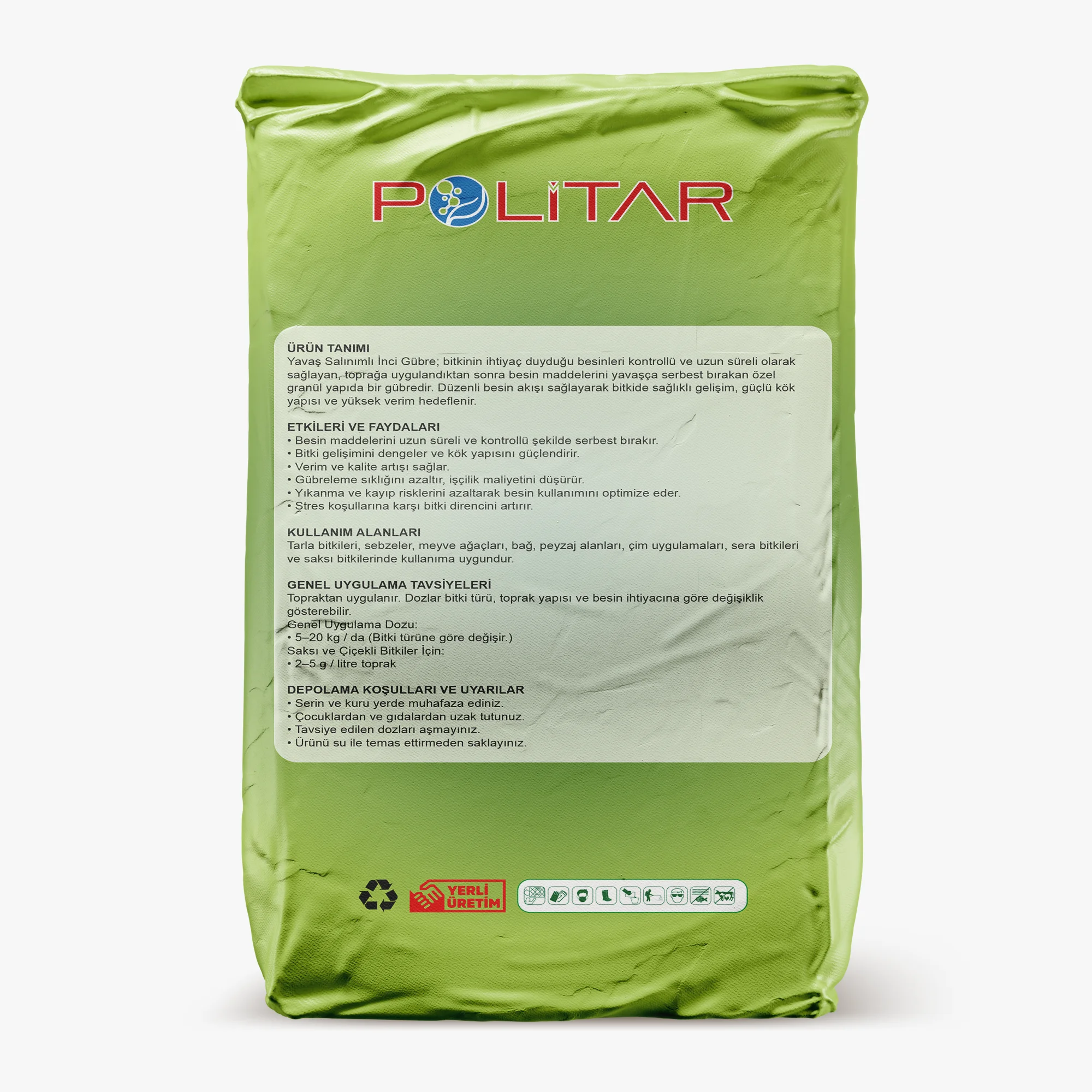 Yavaş Salınımlı İnci Gübre; bitkinin ihtiyaç duyduğu besinleri kontrollü ve uzun süreli olarak sağlayan, toprağa uygulandıktan sonra besin maddelerini yavaşça serbest bırakan özel granül yapıda bir gübredir. Düzenli besin akışı sağlayarak bitkide sağlıklı gelişim, güçlü kök yapısı ve yüksek verim hedeflenir.